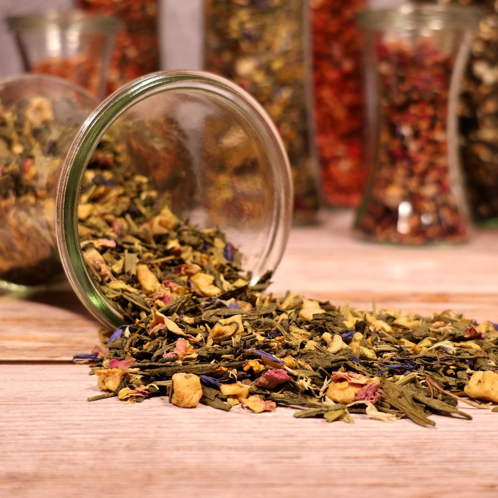 Grüntee, Ingwer, Apfelstücke, Mandarinenstücke (Rohrzucker, Mandarine, Säuerungsmittel Zitronensäure), Lemongras, Aroma, Pomelostücke (Pomeloschale, Zucker, Säuerungsmittel: Zitronensäure), Grüntee Matcha Pulver, Sonnenblumenblütenblätter, Rosenblütenblätter, Kornblumenblütenblätter, weiß Kornblumenblütenblätter