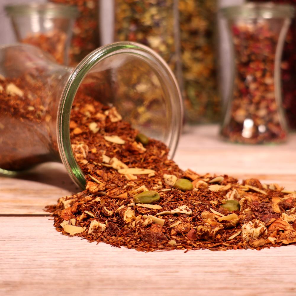 Rooibos, Apfelstücke, Weinbeeren, Mandelstücke, Pistazienkerne, Aroma