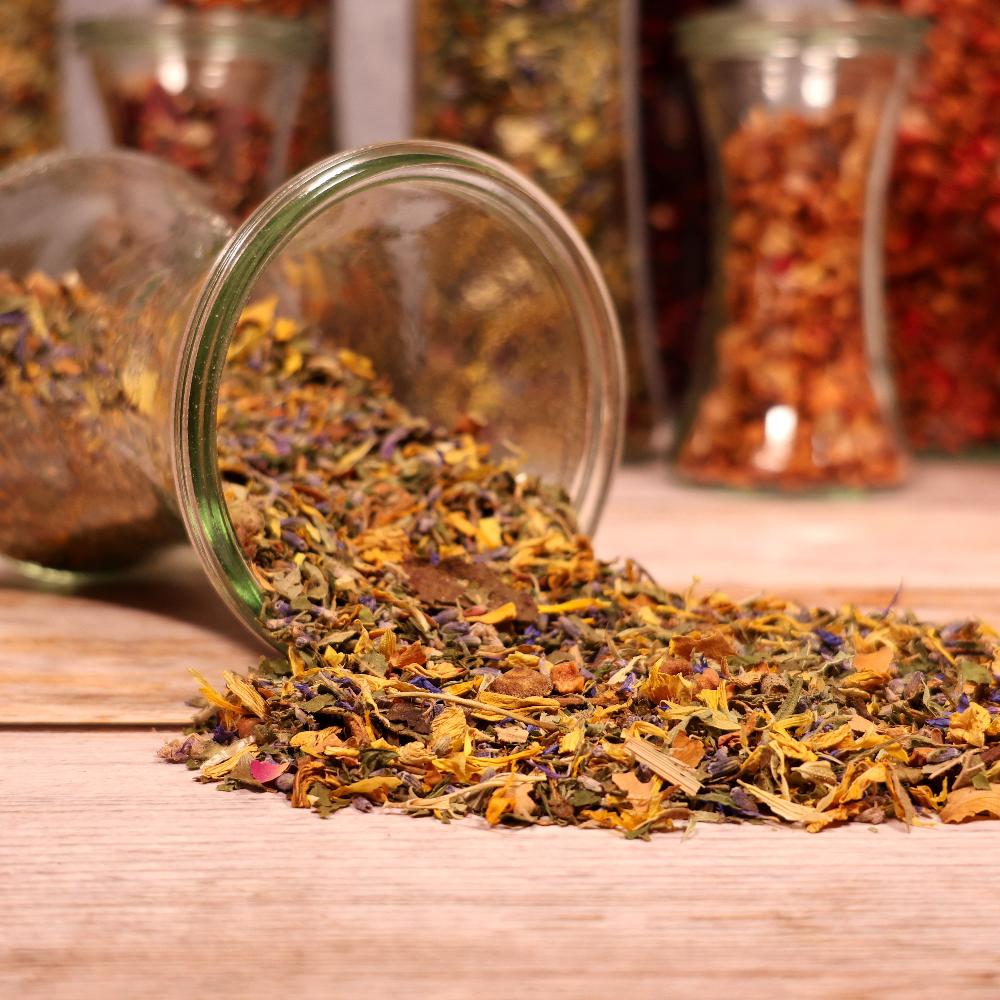 Angenehme Kräutermischung mit Kräutern, Pfefferminze, Lavendel und Apfel.