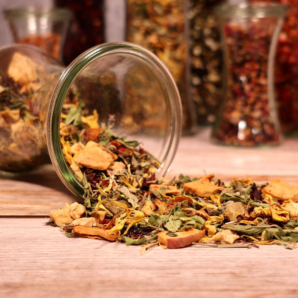 Naturbelassene Kräutermischung mit Kräutern und Sanddornbeeren.